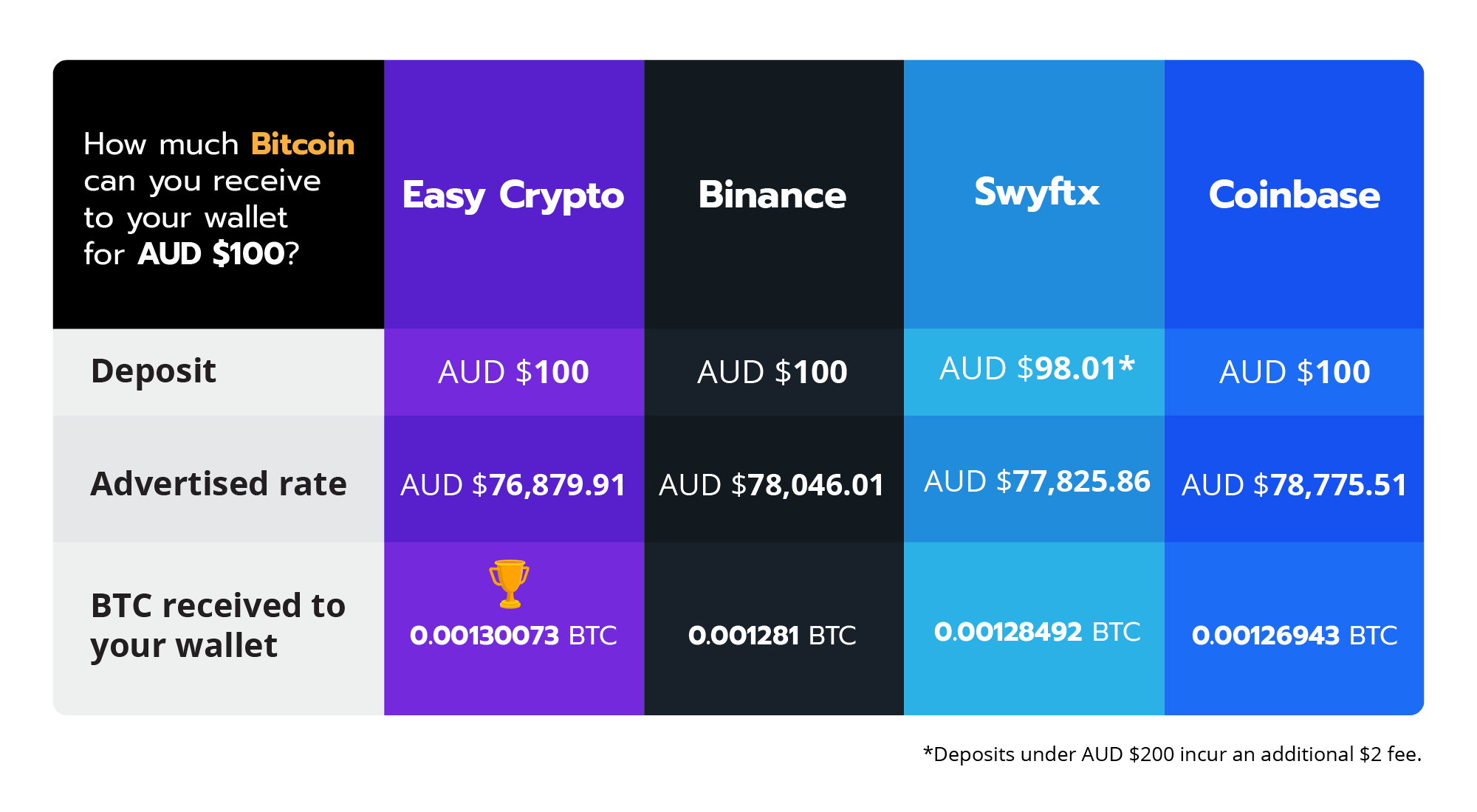 I was able to activate one of the . Very competitive 0.85% trading fee. Between 0.1% to 0.5% (depending on trading volume) . Furthermore, there are no ongoing fees, so you can keep your crypto . Thanks to global liquidity providers, swyftx crypto exchange australia offers low trading fees and low spreads for traders. Digital surge is one of the most affordable exchanges in australia for crypto investors. Instantly buy or sell over 250 cryptocurrencies with a fee of only 0.5% using osko or payid. Low flat fee of 0.1% when you trade on the platform · reduce your trading fees even further with the native exchange cryptocurrency, binance coin · access binance . On this platform, you can deposit and withdraw fiat for . Depositing and withdrawing aud is always free of charge regardless of the payment method that you use, and trading fees are just 0.6 per cent of the transaction . Choosing the best cryptocurrency exchange in australia isn't easy,. Coinstash is a registered digital currency exchange with an afsl. Well, the trading fees range between 1.49% and 3.99% but on the other hand, the exchange offers superb account protection.